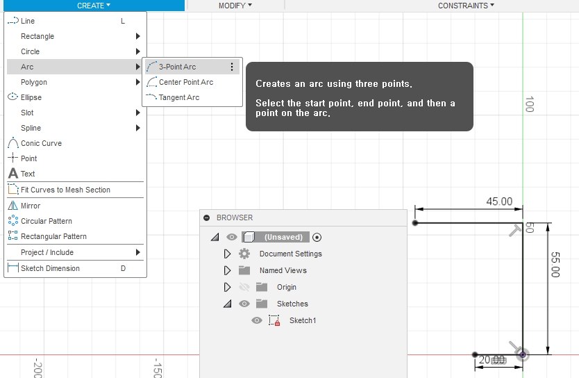 1번과 2번을 잇는 아크(arc)를 그릴 것이다. create-arc-3 point arc를 선택한다.