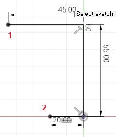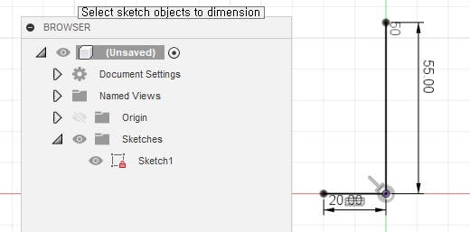 세로중심축을 기준으로 임의의 직선(line, 단축키 L)을 그린다. sketch dimension으로 수치 20mm으로 입력한다. 세로 중심축으로 임의의 직선을 그린다. sketch dimension으로 수치 55mm 입력한다. 그리고 또하나의 직선 45mm를 그린다.