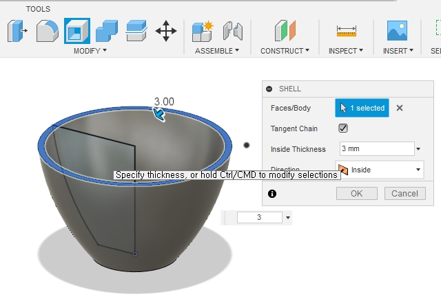 컵모양이 나오려면 안의 내용을 도려내야 한다. modify의 4번째 메뉴가 shell이다. modify의 shell아이콘을 클릭한다. 컵의 윗면을 클릭한다. 수치를 3으로 입력한 후 엔터를 친다. 3mm 두께의 속이 빈 컵모양이 나온다.