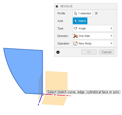 이제 revolve(회전) 기능으로 컵의 형상을 만들 것이다. create의 revolve아이콘을 클릭한다. 회전축인 세로 55mm직선을 클릭한다.