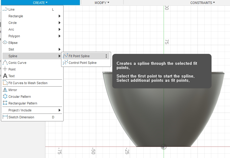 create-spline-fit point spline를 클릭한다. spline은 자유곡선이다. 임의의 4개의 점을 찍으면서 손잡이를 그린다.