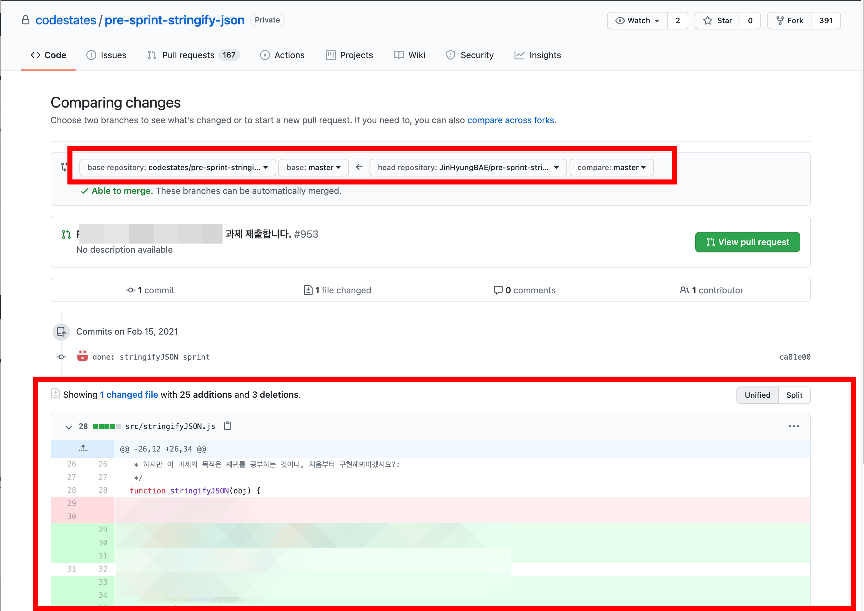 아래 빨간 박스는 내가 제출한 파일이 어디가 수정한 부분인지를 확인할 수 있다. 내가 수정한 곳은 +로 표시된다.