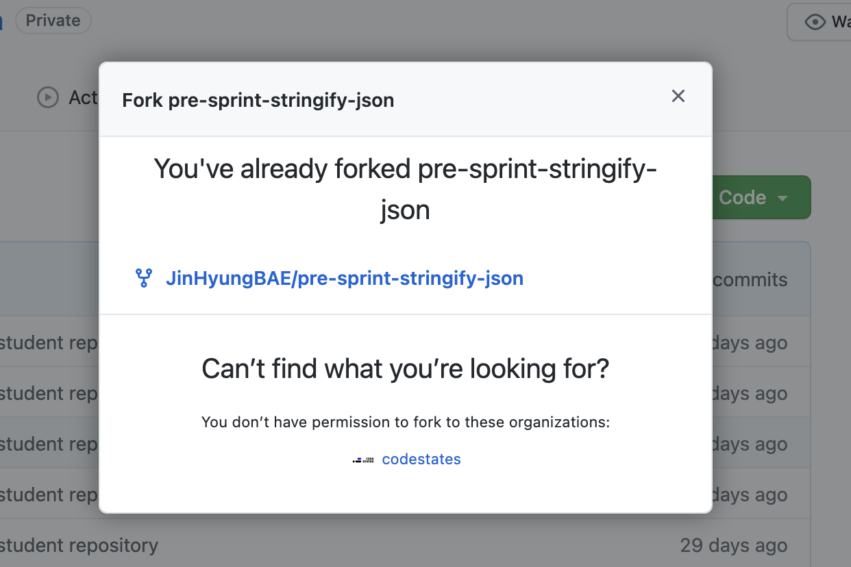 내 github 과제 폴더가 보이는데 이것을 클릭하면 내 과제 폴더로 fork 된다.