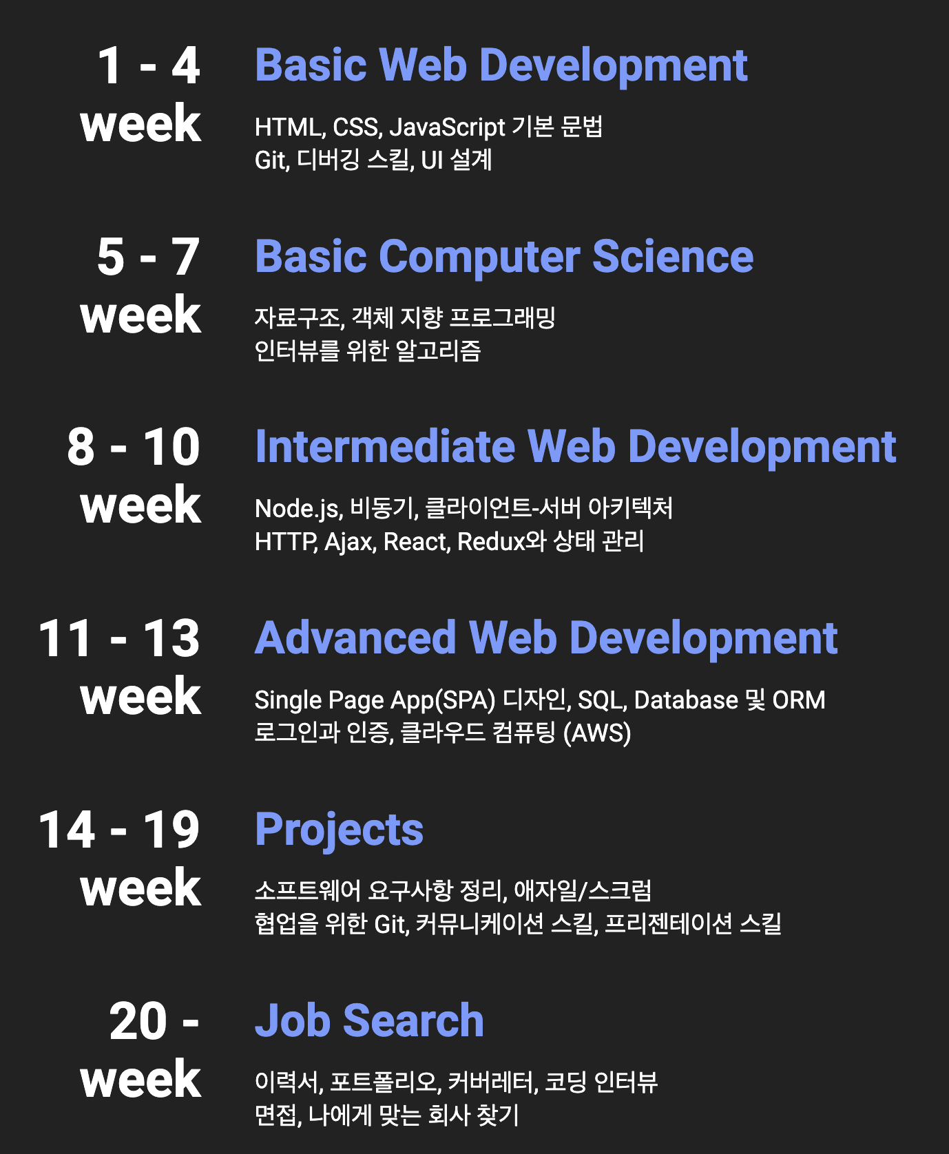 오늘 드디어 코드스테이츠 소프트웨어 엔지니어링 pre 4주 과정이 모두 끝났다. 그동안 배운 것들과 내가 부족한 것과 개선할 점들을 정리해 본다. 이 과정은 javascript 언어(node.js)를 주로 사용하면서 프론트엔드와 백엔드 개발자로 성장하는데 필요한 것들을 배우는 과정이다. 코드스테이츠 홈페이지에 소개된 간단한 소프트웨어 엔지니어링 커리큘럼은 다음과 같다.